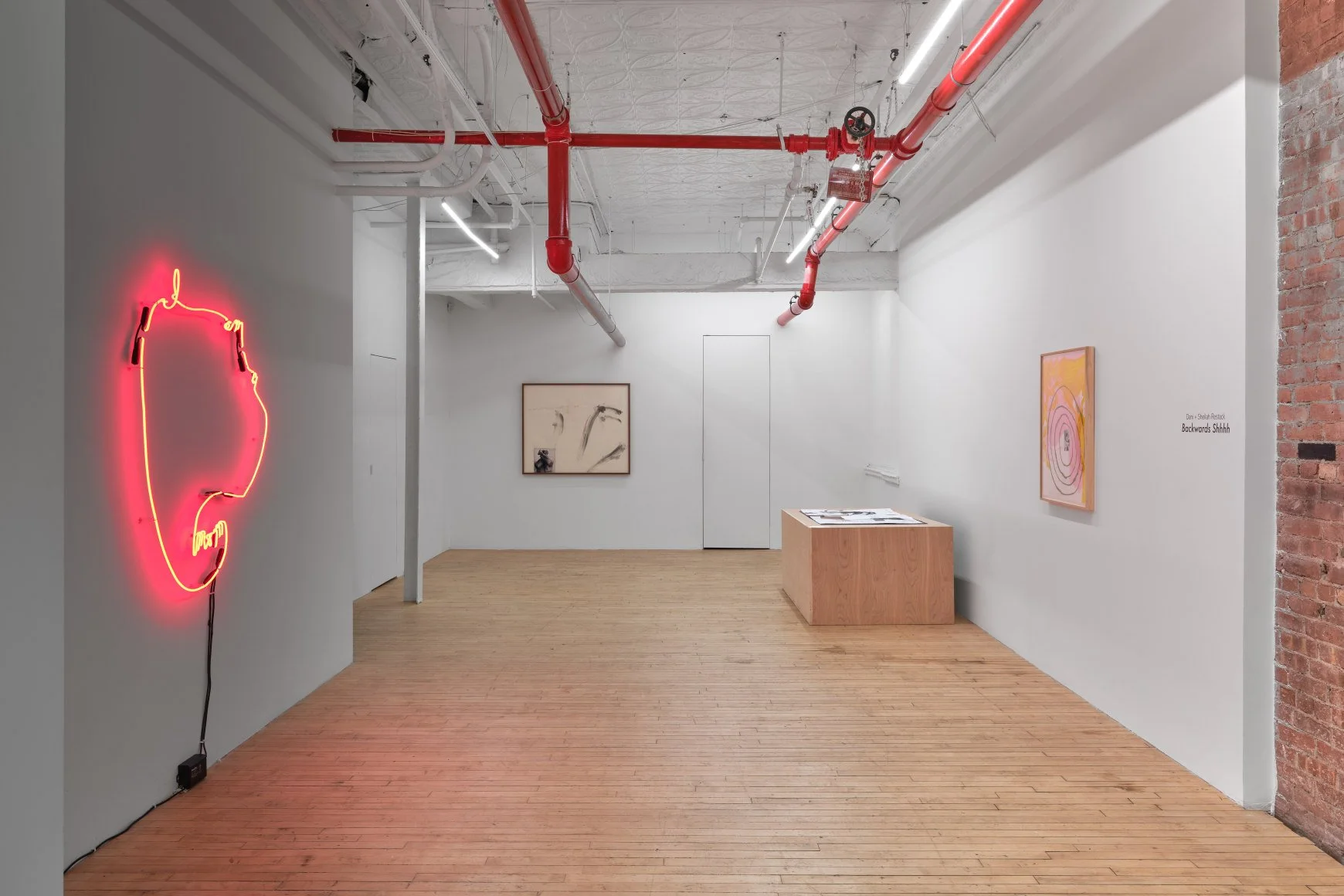 Through the incorporation of a variety of traditional and found objects, materials, and imagery, the works across Backwards Shhhh legitimize manifold interpretations of their condition and being. Their universal, visual language acts as an invitation for excavation, exploration and an embodiment of feeling. Basking in the ruby red essence of I am a Mom, one enters a state of meditative reflection – complicated feelings of pride, joy, love, grief, shame, self-doubt, loneliness, independence, and agency rise to the surface. This light refuses to be contained, permeating the space and imparting its energy and influence on everything within its reach.